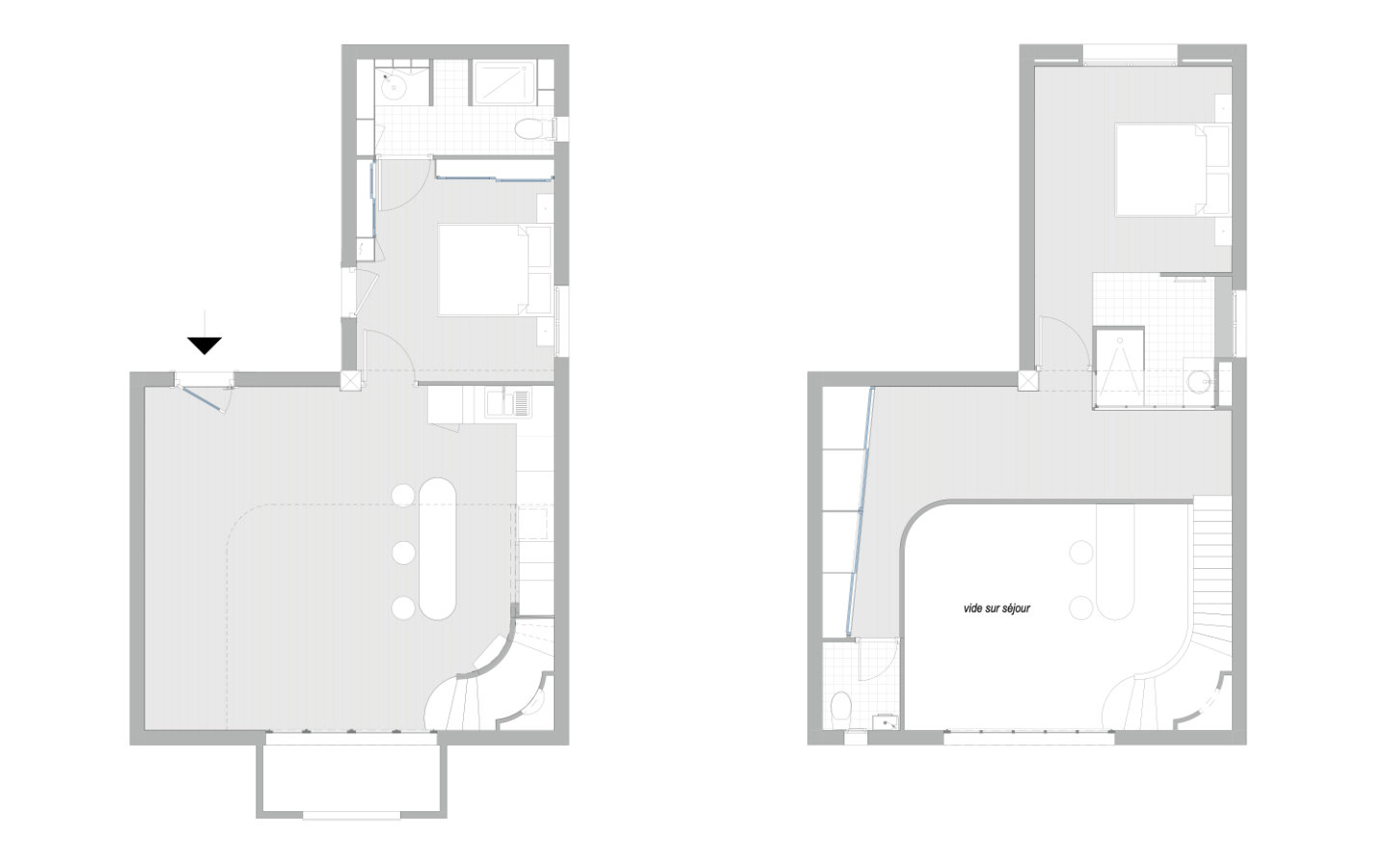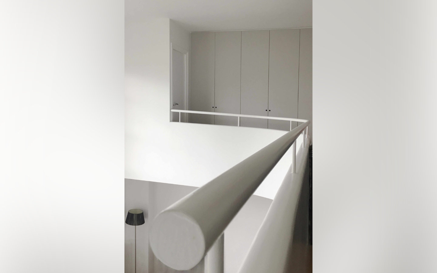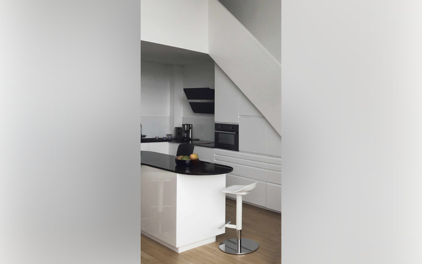 La cuisine, ouverte sur le salon/séjour, a trouvé sa place sous l’escalier tandis que la suite parentale se développe à l’étage.